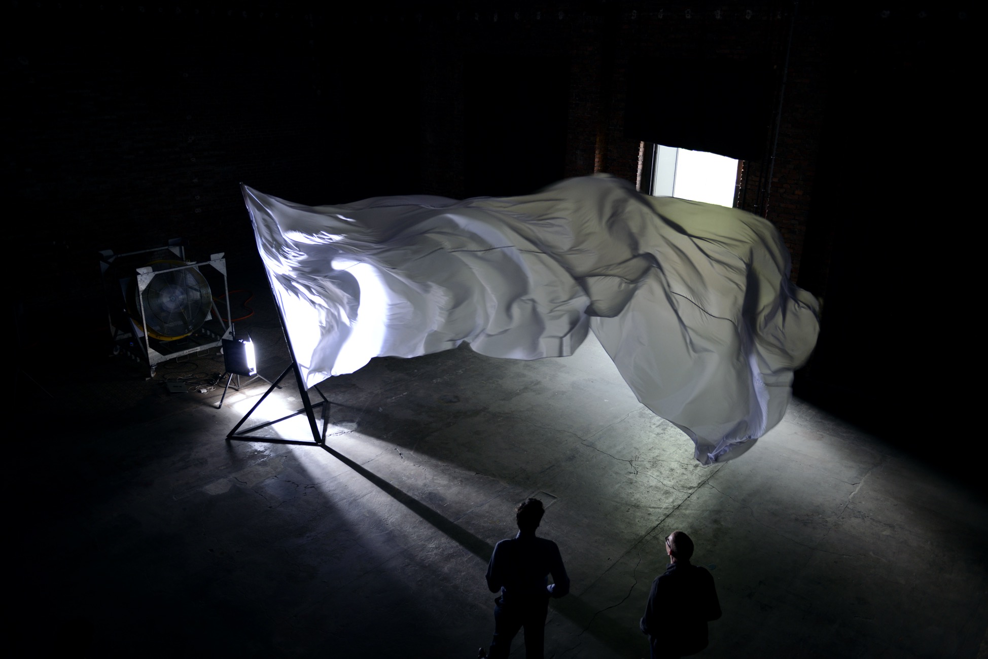 The white banner, carrier medium for communicative content, is both a canvas and a painterly gesture that sketches a continuous three-dimensional drawing in space.