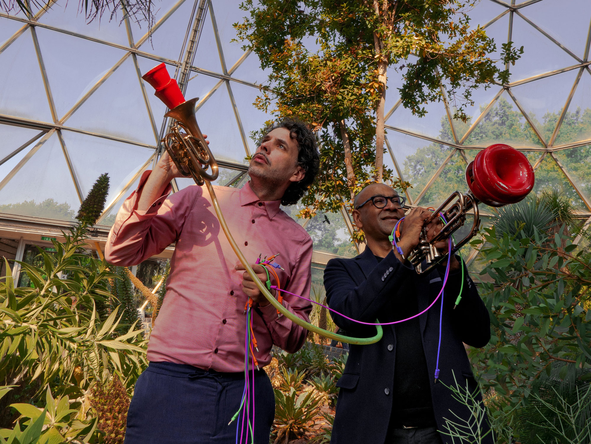 Over the years, Rajesh Mehta has innovated a variety of instruments under the title "Hybrid Trumpets": including a slide trumpet inspired by Indian music microtonality and a rare Bass trumpet that connects other trumpets and devices through tubes to create extended sound worlds. Additionally, Mehta interacts with the architectural acoustics and moves within the space as he plays. Schulze projects contrapuntal sound panoramas using analog modular synthesizers through multichannel speaker systems into the space, which can evoke abstract representations of fauna and flora.